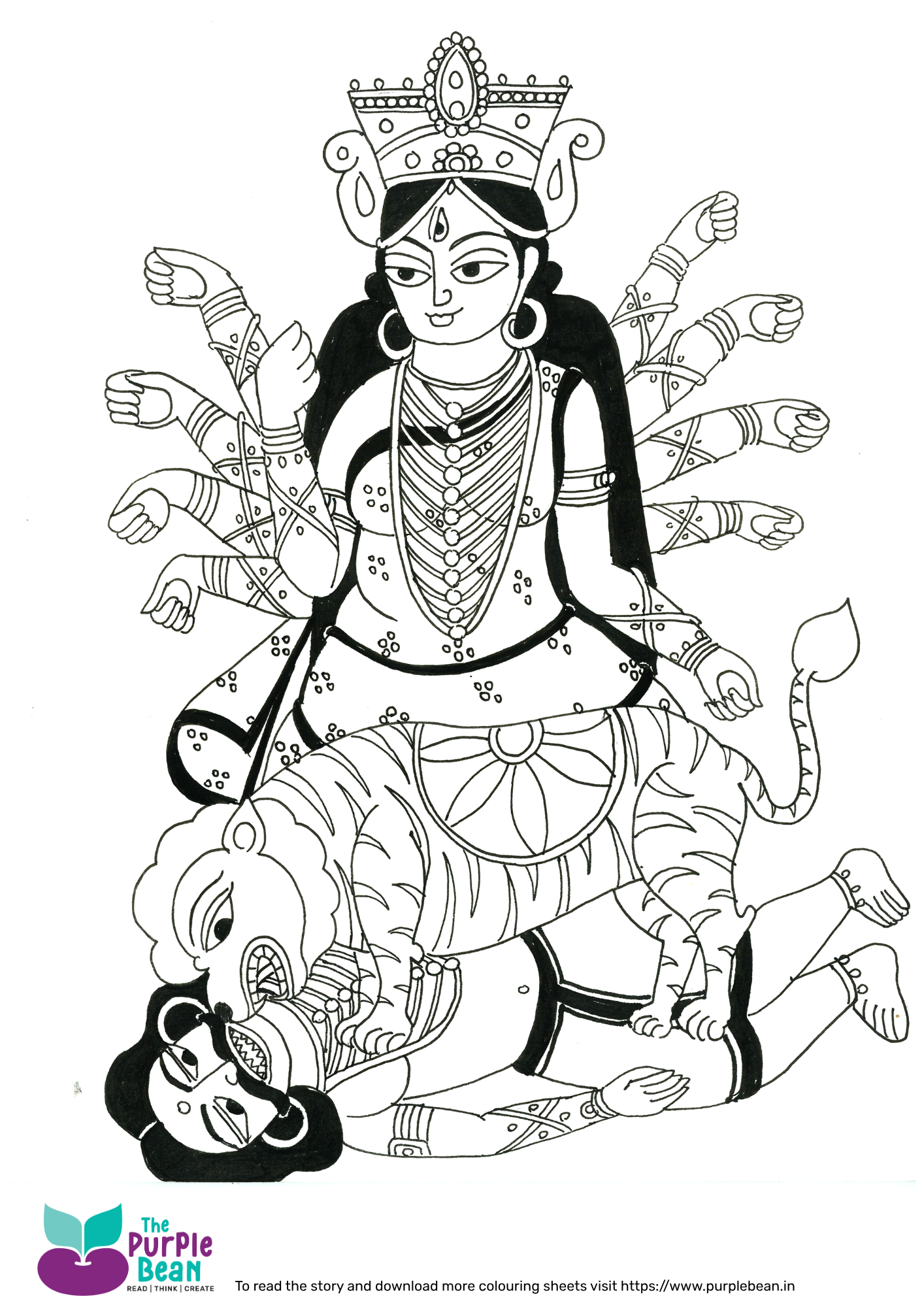 Right click or long press to download and print the colouring sheet. You can read the story of Durga and Mahishasura here.