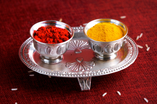 Saffron is valued for both its flavour and its bright yellow colour. When mixed with milk, it slowly releases its colour into sweets and drinks. Turmeric, along with ingredients like alum and lemon juice, is used to make the red kumkum powder used in ceremonies.